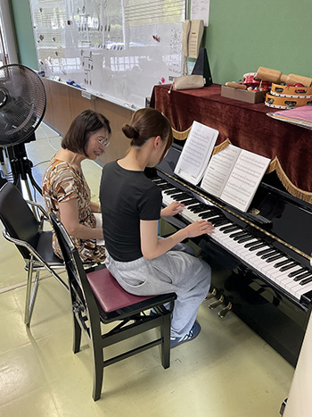また、授業以外でも練習ができるよう各教室にピアノを1台を設置し、授業で使用する器楽演習室は常時開放しています。昼休みや放課後などは、クラスメイトとおしゃべりをしながら学生たちは練習しています。
